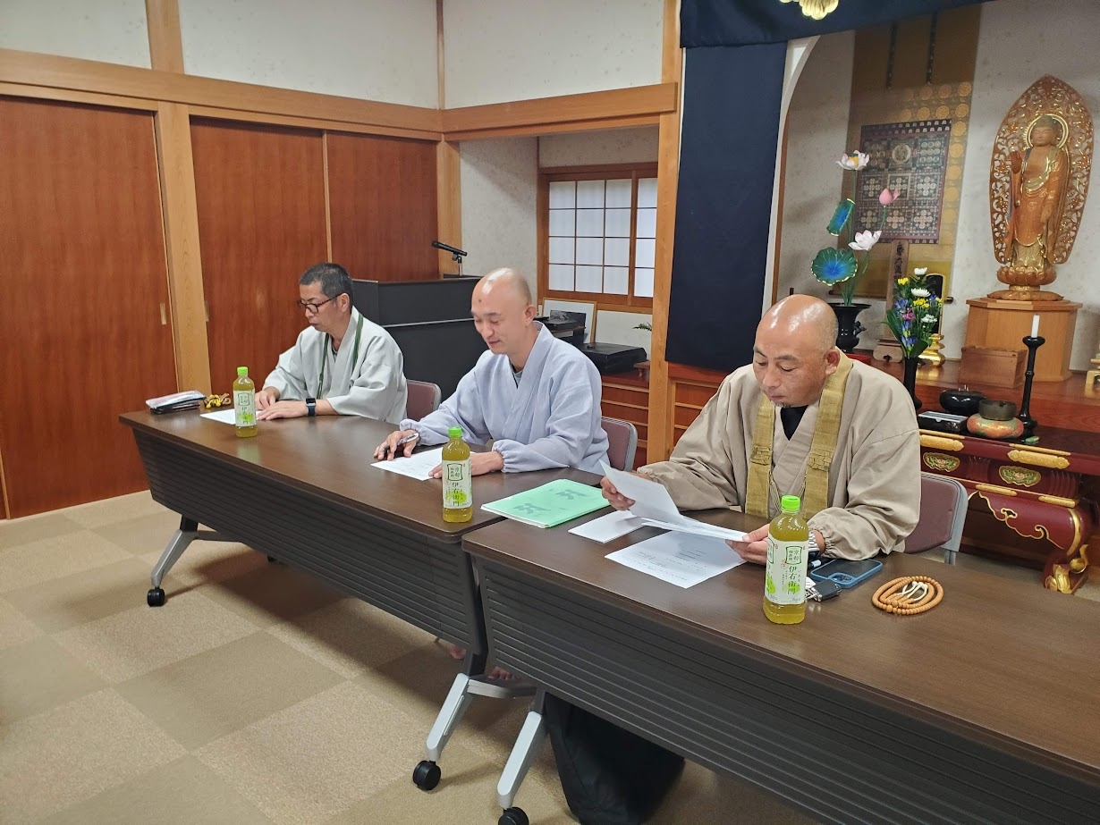 続いて新役員が席上に着き、この4月より新支所長に就任されました光明寺 明保能弘嗣僧正、宗会議員に就任されました山路寺 新田光俊僧正よりご挨拶があり、新副長3名の承認ならびに新代議員の辞令伝達、そして新代議員の中から議長、副議長、監事を選出し、令和7年度の事業計画ならびに予算案の審議を行い、承認されました。